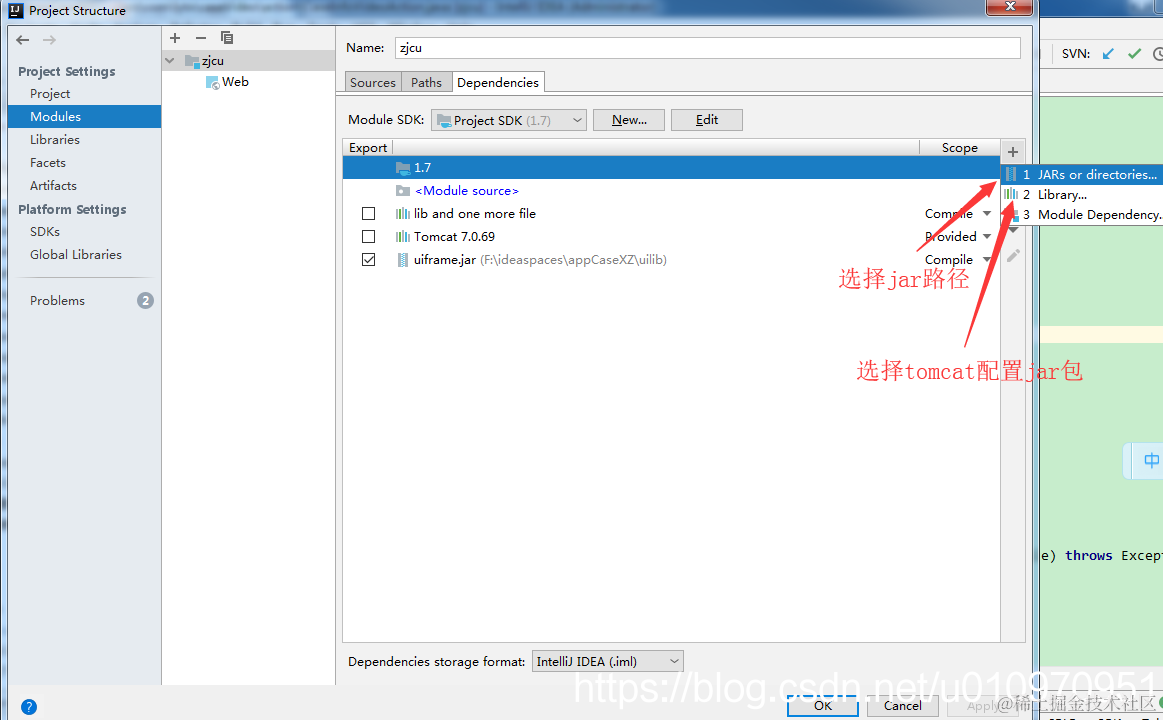 配置Dependencies,为项目依赖的jar包,首先选择jars or directions选择项目中的jar路径。如果是需要tomcat启动的web项目,添加入library中的tomcat jar包(第5步查看完整tomcat配置),或者其他自己需要依赖的jar,并且去除列表中红色的项(无效jar包)