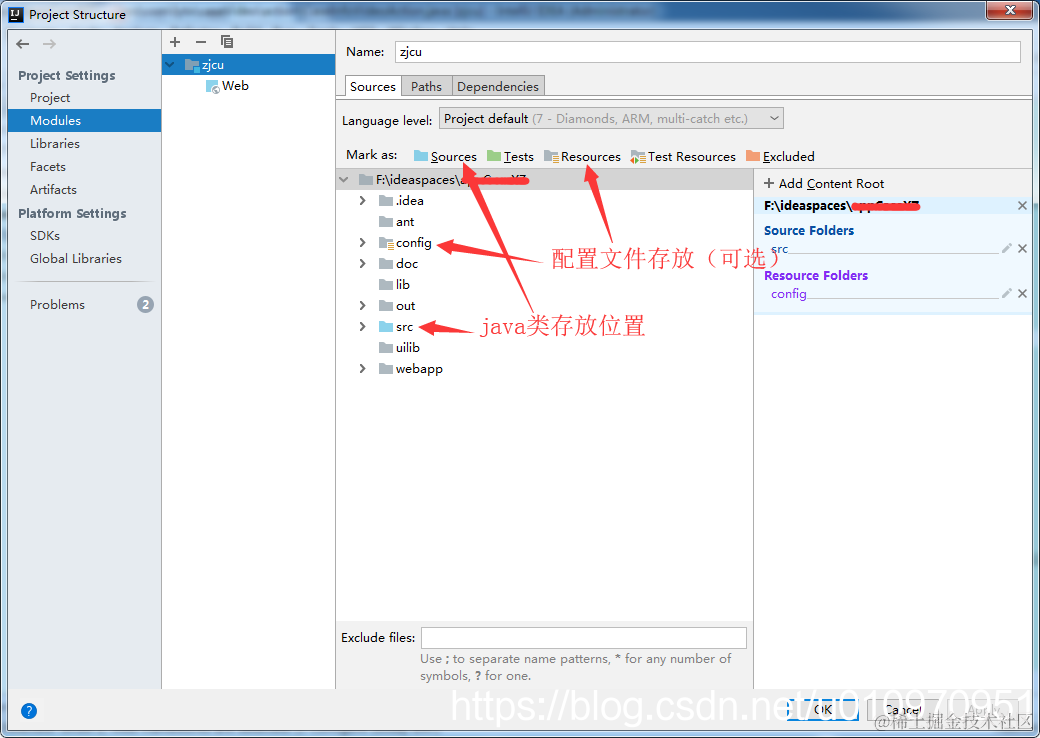 Resources:源代码位置,配置文件,例如log4j、数据库配置properity等(可选)