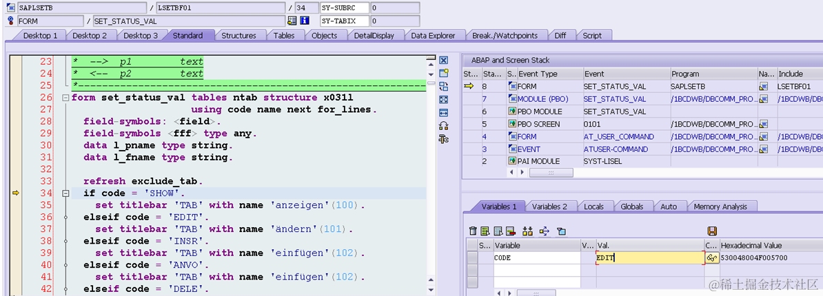 - 敲回车,debugger在subroutine SET_STATUS_VAL 停下来,将34行的变量code 内容从SHOW改成EDIT: