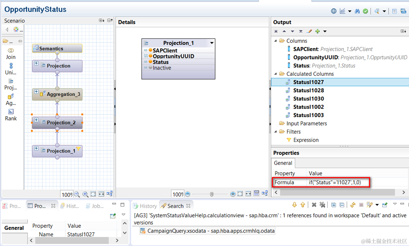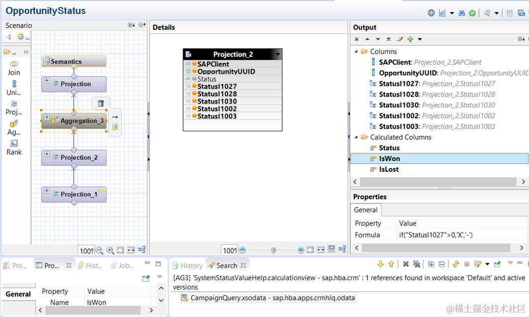 这个calculation view被大量用于CBA的tile里,it will show the total number of Opportunities with the following status: