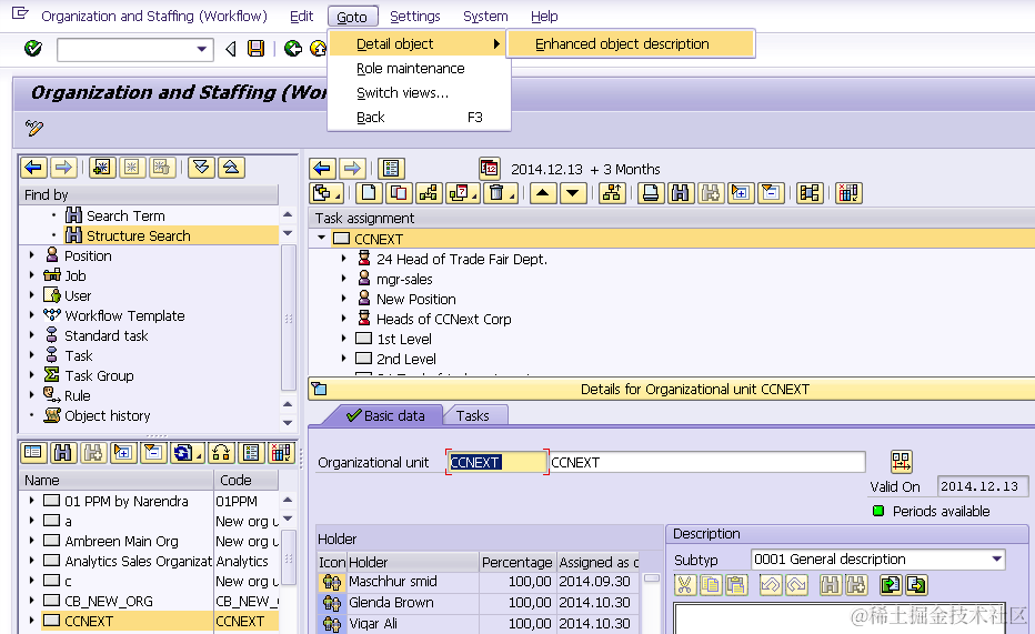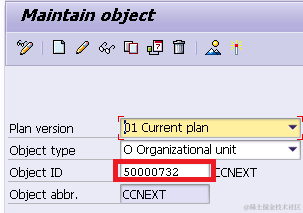 或者通过后台Tcode PPOM,找到对应的Organization unit,menu Goto->Detail object->Enhanced object description: