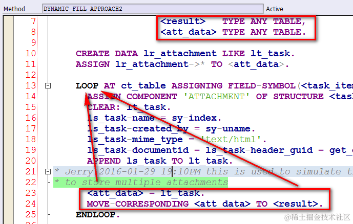 注意这里line 24的两个field symbol都是完全generic的,而且赋值在LOOP里完成,所以方法2的泛型处理次数为 1 + task个数。