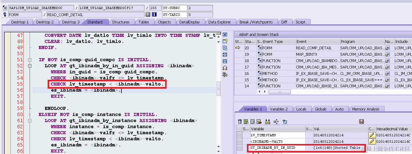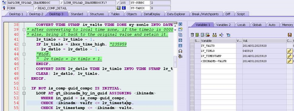 Although the IBASE component information is already available in buffer, unfortunately since the check in line 55 fails, ( due to lv_timestamp is now equal to <ibinadm>-valto), CRM_IBASE_COMP_GET_DETAIL is called unexpectedly and ended up with error code 2 - doesnt_exist