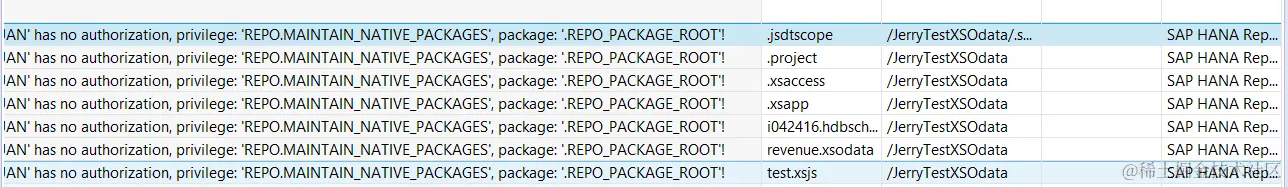 Description Resource Path Location Type [40156] Repository: User is not authorized to execute specified operation;User 'LIGUAN' has no authorization, privilege: 'REPO.MAINTAIN_NATIVE_PACKAGES', package: '.REPO_PACKAGE_ROOT'! .jsdtscope /JerryTestXSOdata/.settings SAP HANA Repository Problem Uploading files to repository... Repository: User is not authorized to execute specified operation;User 'LIGUAN' has no authorization, privilege: 'REPO.MAINTAIN_NATIVE_PACKAGES', package: '.REPO_PACKAGE_ROOT'!, code: 40,156 Repository: User is not authorized to execute specified operation;User 'LIGUAN' has no authorization, privilege: 'REPO.MAINTAIN_NATIVE_PACKAGES', package: '.REPO_PACKAGE_ROOT'!, code: 40,156 Repository: User is not authorized to execute specified operation;User 'LIGUAN' has no authorization, privilege: 'REPO.MAINTAIN_NATIVE_PACKAGES', package: '.REPO_PACKAGE_ROOT'!, code: 40,156 Repository: User is not authorized to execute specified operation;User 'LIGUAN' has no authorization, privilege: 'REPO.MAINTAIN_NATIVE_PACKAGES', package: '.REPO_PACKAGE_ROOT'!, code: 40,156 Repository: User is not authorized to execute specified operation;User 'LIGUAN' has no authorization, privilege: 'REPO.MAINTAIN_NATIVE_PACKAGES', package: '.REPO_PACKAGE_ROOT'!, code: 40,156 Repository: User is not authorized to execute specified operation;User 'LIGUAN' has no authorization, privilege: 'REPO.MAINTAIN_NATIVE_PACKAGES', package: '.REPO_PACKAGE_ROOT'!, code: 40,156 Repository: User is not authorized to execute specified operation;User 'LIGUAN' has no authorization, privilege: 'REPO.MAINTAIN_NATIVE_PACKAGES', package: '.REPO_PACKAGE_ROOT'!, code: 40,156