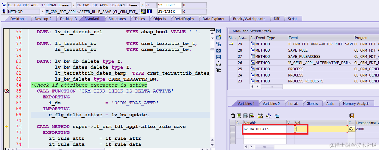 - Click save button, then breakpoint will be triggered. Change lv_bw_update to X in debugger, then F8: