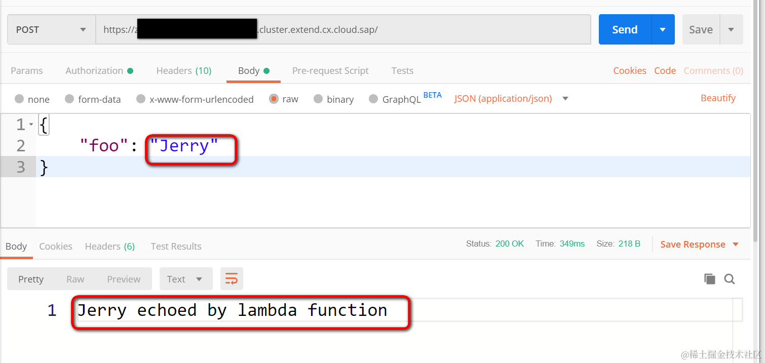 在Kyma提供的函数测试控制台里,发送一个请求,得到添加了后缀的字符串,简单易懂。