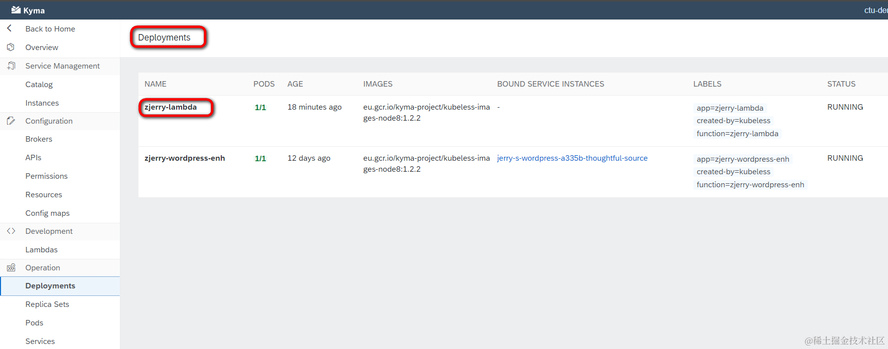 在Kyma的控制台里能找到Lambda Function创建后,Kyma后台自动生成的对应资源:
