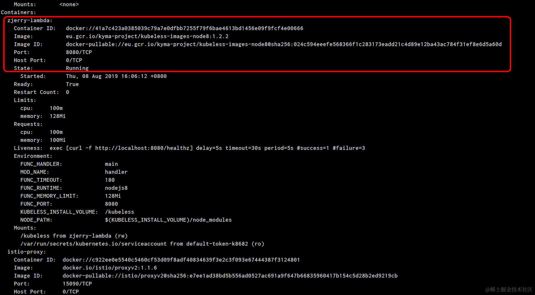 同样的,使用kubectl describe pod命令可以查看这个pod的明细,找到里面包含的docker ID和docker镜像ID.