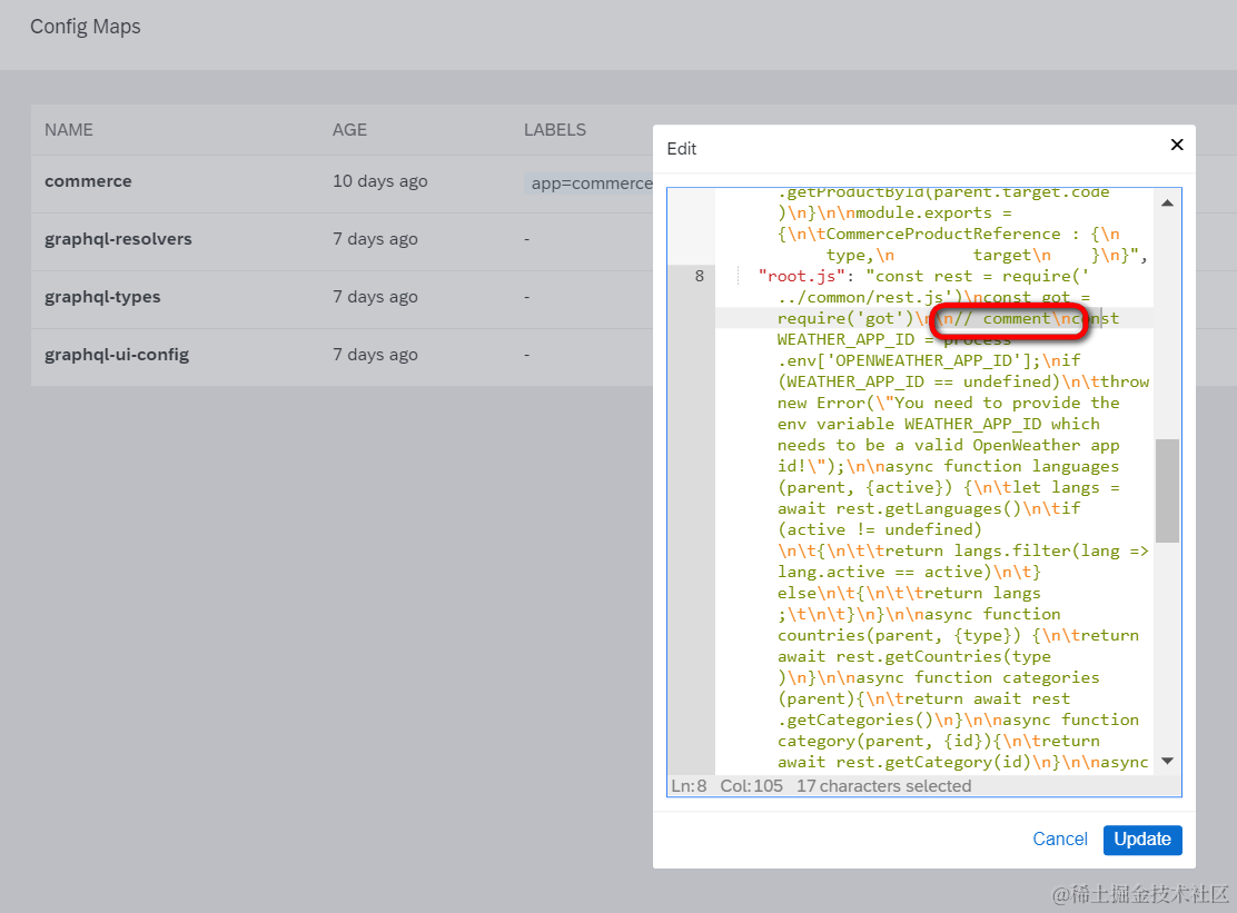 SAP Kyma GraphQL storage实现 已注销 2021-04-25 38 阅读1分钟 以root.graphql为例,左边为root的GraphQL schema,右边为resolver: 加一行注释: 一个vue小应用: vue的框架代码: 点了update按钮后,触发这三个请求: 请求负载: 请求url: 第二个请求则是存储加了//comment的resolver,即root.js: 从请求的payload也能发现并没有delta的机制,而是完全覆盖。 响应:configmap: 即这几个configMap: 要获取更多Jerry的原创文章,请关注公众号"汪子熙":