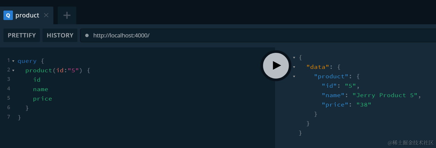GraphQL的query:一个最简单的例子 已注销 2021-04-25 478 阅读1分钟 首先定义一个Product类型的对象,拥有id,name,price等基本字段: 然后定义一个query,输入参数为id,返回的类型正是Product: 这个query的实现,我简单的给product的price字段生成一些随机数: 测试: 输入查询结构: query { product(id:"5") { id name price } } 得到期望的输出: 要获取更多Jerry的原创文章,请关注公众号"汪子熙":