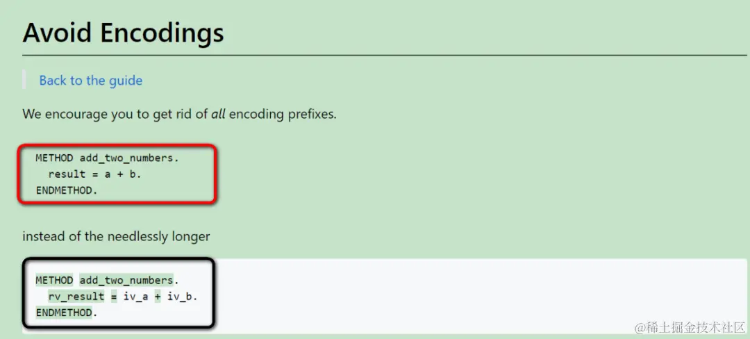 SAP这个github文件给出的推荐是,建议在给方法实现里的变量名取名时,避免使用前缀。下图红色高亮的代码是推荐的做法,而黑色的代码是应该避免的代码。
