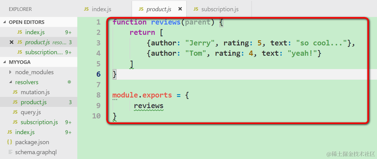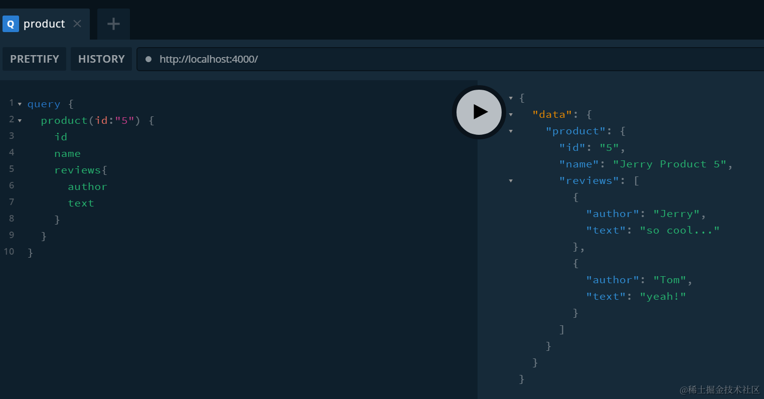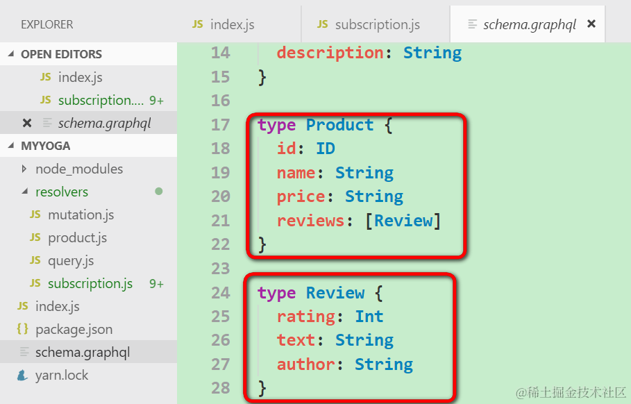 首先在schema里创建一个Product类型,这个类型除了基本字段id,name,price外,还有一个复合字段reviews,其类型是一个结构,另外通过另一个类型Review单独定义。左右中括号代表这是一个数组: