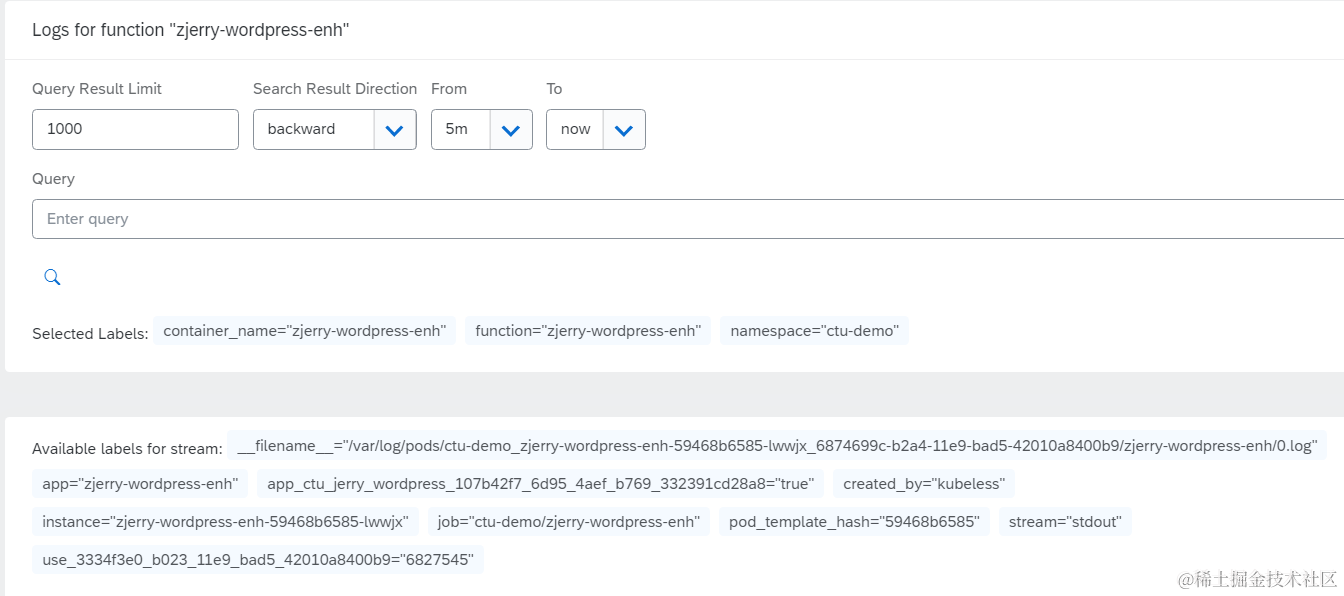 Available labels for stream: filename-="varlog/pods/ctu-demo ziery-wordpress-enh-59468b6585-lwwjx 6874699c-b2a4-11e9-bad5-4201080Ob/ziery-wordress-nh/o.ogapp=“zjerry-wordpress-enh” app_ctu jerry_wordpress_ 107b4217_6d95 4aef_ b769 332391cd28a8=“true” created _by=“kubeless”