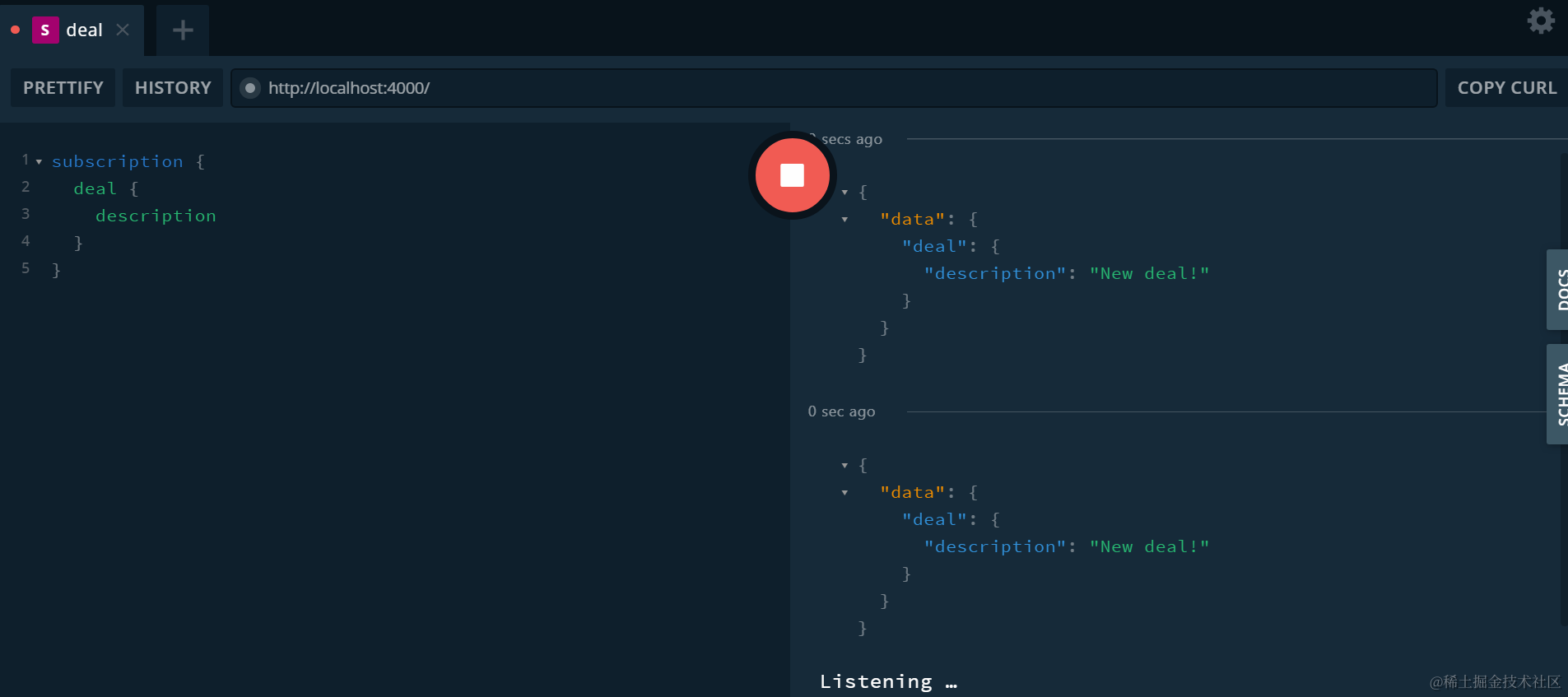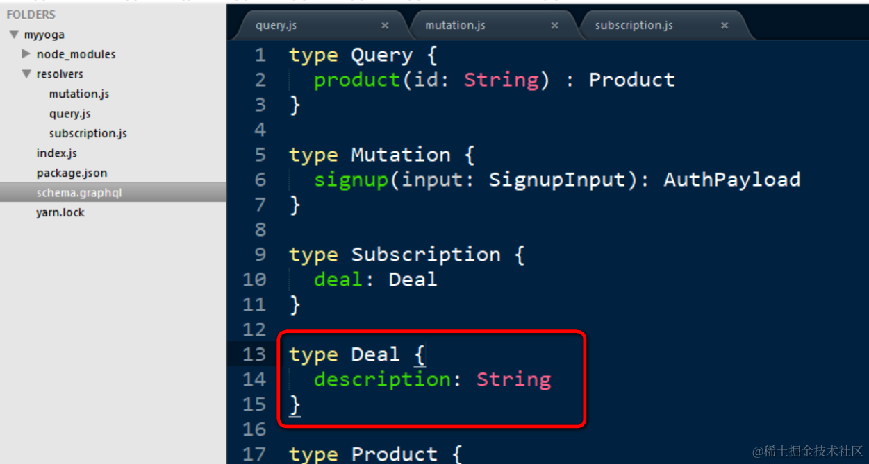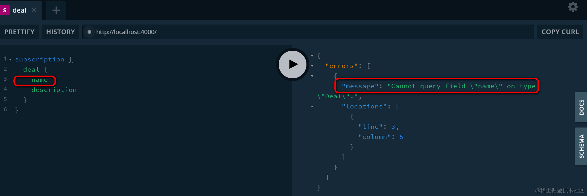 GraphQL query的schema校验 已注销 2021-04-25 94 阅读1分钟 schema.graphql里我定义了一个类型为Deal,只有一个名为description的字段: 在服务器实现里引用这个schema文件: 在playground里使用如下的结构进行测试,得到期望的结果: subscription { deal { description } } 故意插入一个不存在的字段,马上报错: Cannot query field “name” on type “Deal”. 要获取更多Jerry的原创文章,请关注公众号"汪子熙":
