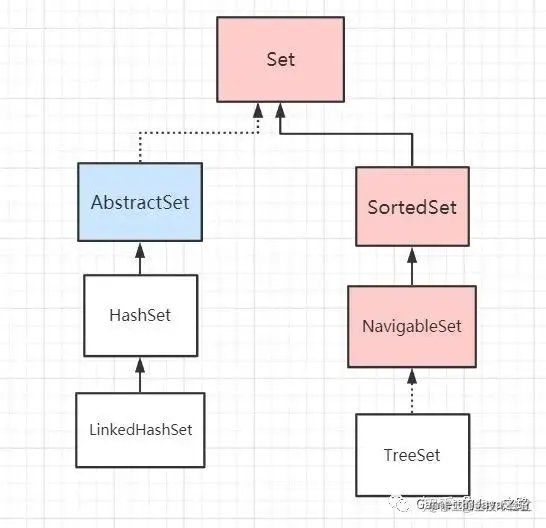 Set接口继承了Collection接口,是一个不包括重复元素的集合,更确切地说,Set 中任意两个元素不会出现 o1.equals(o2),而且 Set 至多只能存储一个 NULL 值元素,Set 集合的组成部分可以用下面这张图概括: