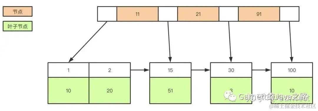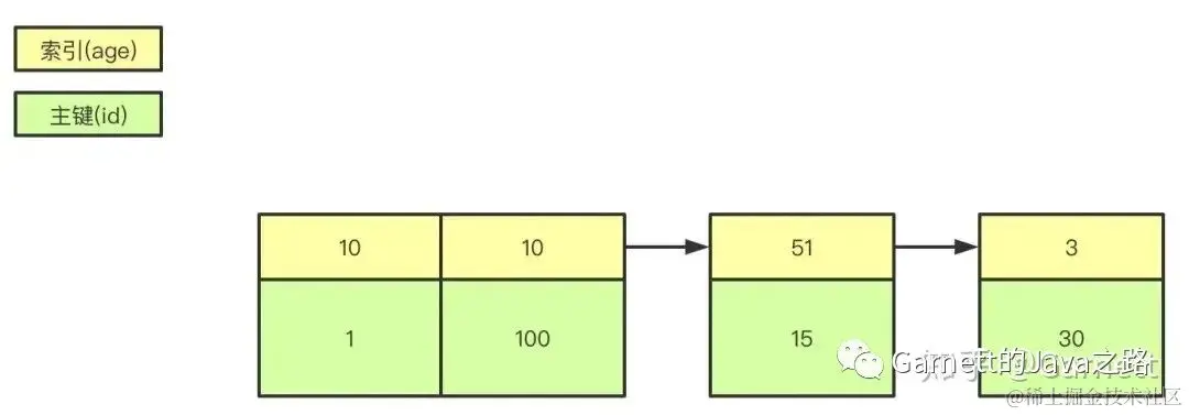 create table user( id int(11) not null, age int(11) not null, primary key(id), key(age) ); B+树是左小右大的顺序存储结构,节点只包含id索引列,而叶子节点包含索引列和数据,这种数据和索引在一起存储的索引方式叫做聚簇索引,一张表只能有一个聚簇索引。假设没有定义主键,InnoDB会选择一个唯一的非空索引代替,如果没有的话则会隐式定义一个主键作为聚簇索引。\
