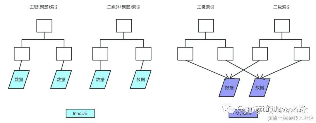 最终,我们一张图看看InnoDB和Myisam聚簇和非聚簇索引的区别