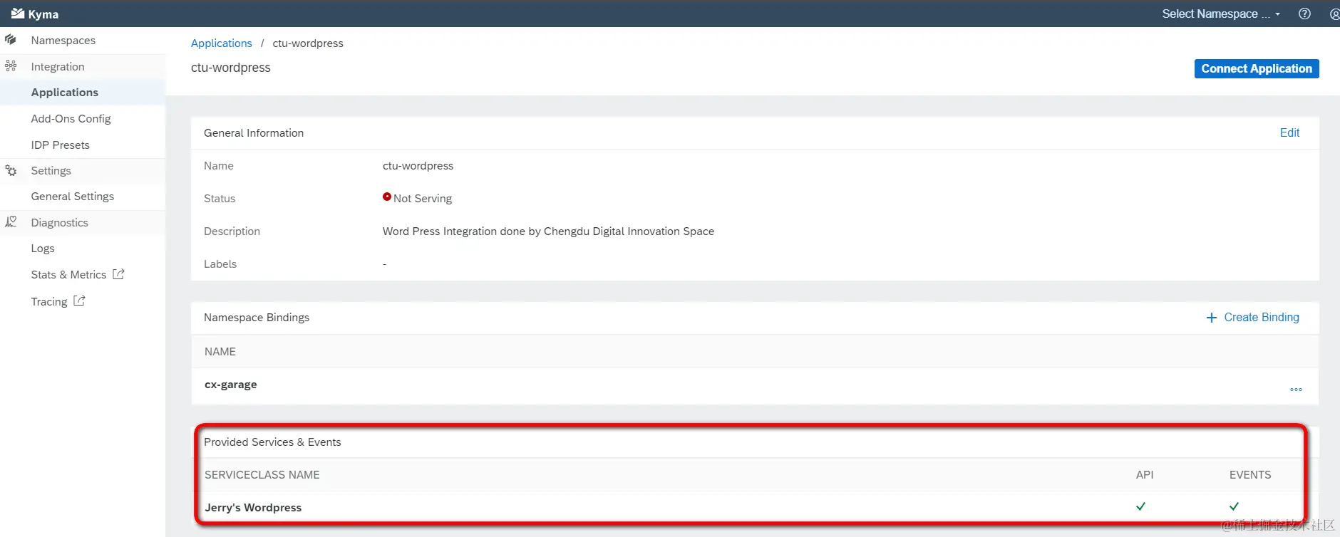 注册成功后,在Kyma控制台的应用界面的服务和事件列表里,就能看到WordPress的对应记录了: