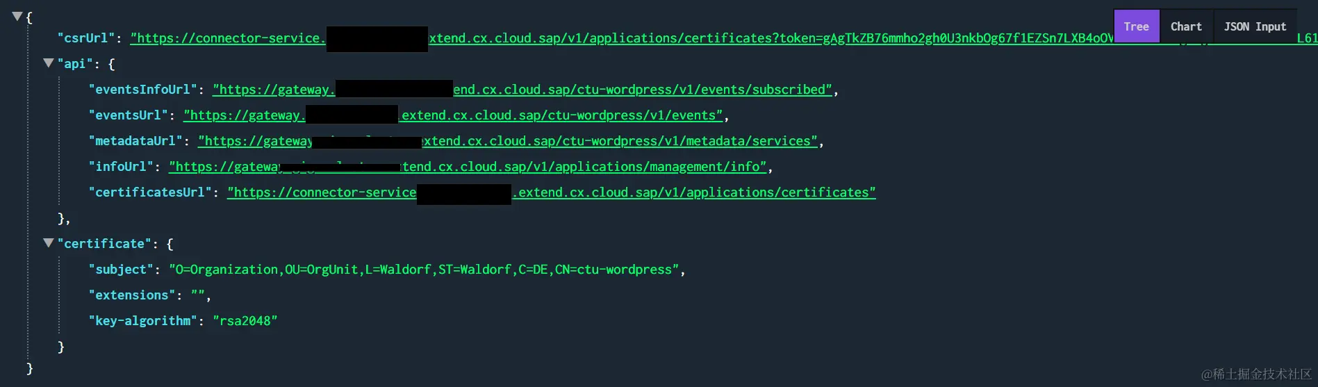 这个JSON响应的第一个字段csrUrl(Certificate Signing Request)和最后一个字段certificate,包含的信息用来生成用于在WordPress和kyma之间建立SSL连接所必需的数字证书。而api结构的几个字段则是Kyma Service Catalog注册的endpoint.