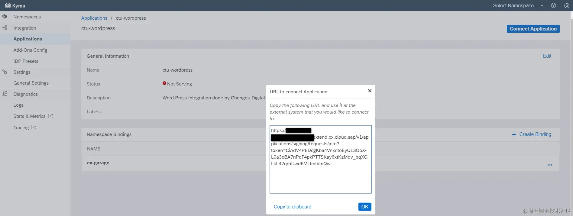 在Kyma里创建一个新的应用,点击Connection Application这个按钮,弹出来的这个对话框里的url即是我们要找的url.