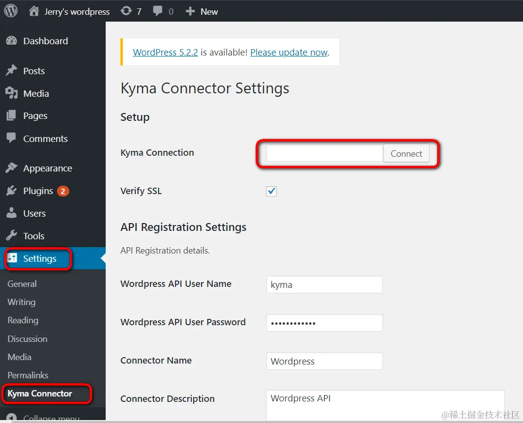 WordPress的Kyma插件安装完毕后,在设置选项里,能看到对应Kyma连接的维护界面。