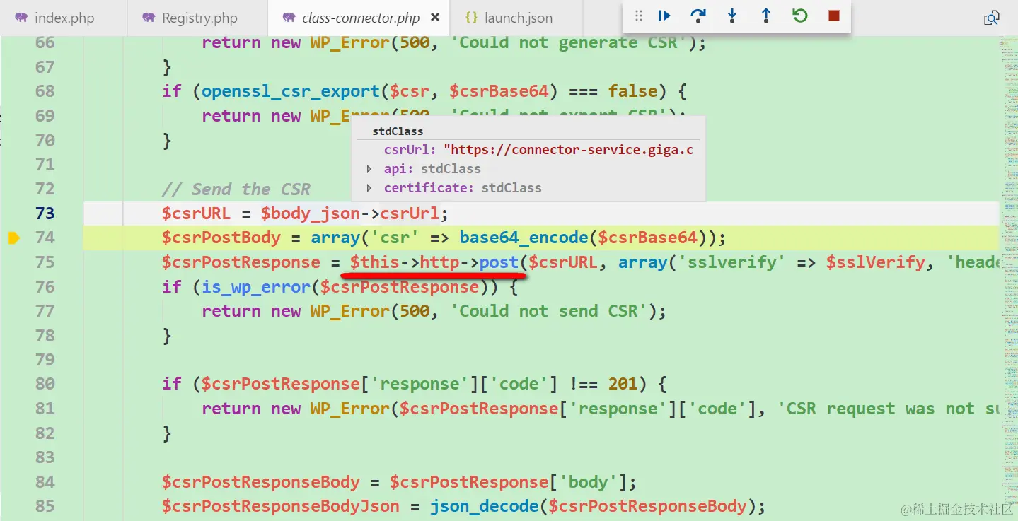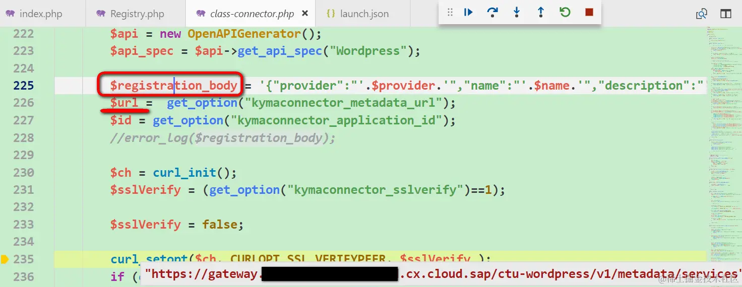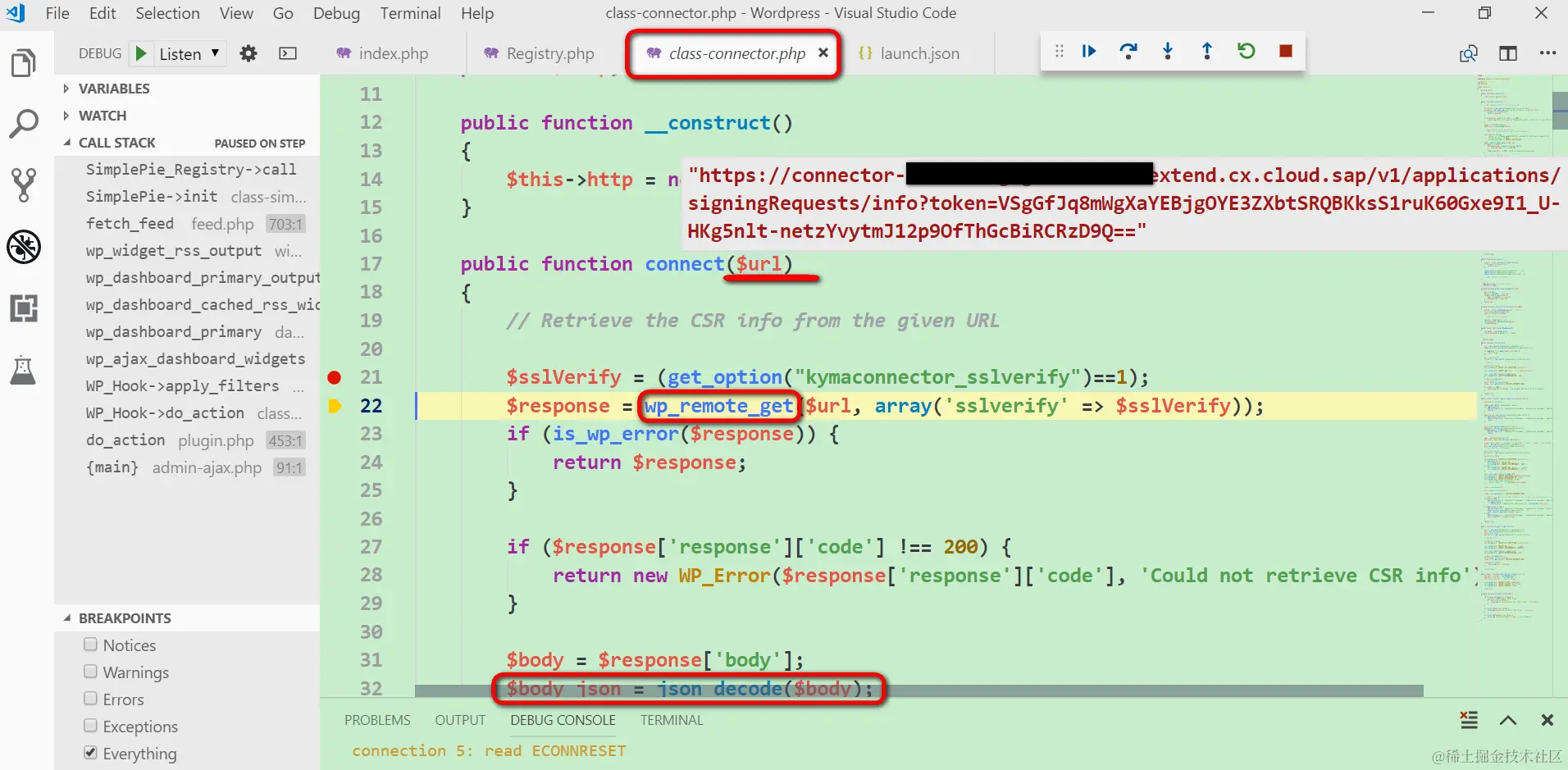 设置在class-connector.php的connect函数内的断点即触发。这个函数负责向传入的url发起HTTP GET请求,解析出Kyma返回的CSR url和Kyma服务目录的endpoint,然后再分别发起不同的HTTP post请求,去拿到Kyma返回的数字证书以及将WordPress的指定事件注册到Kyma上去。
