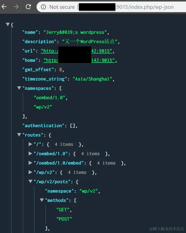 浏览器里访问url:<安装WordPress的主机名>/index.php/wp-json, 即可得到所有API列表: