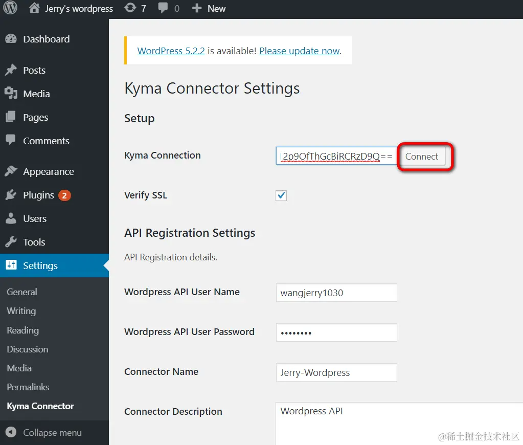 我们把这个url复制到WordPress的Kyma插件里,点击Connect按钮,即可发起指向Kyma实例的连接。