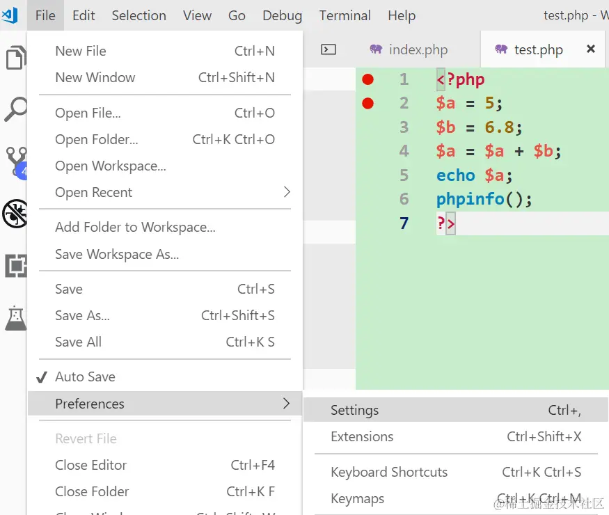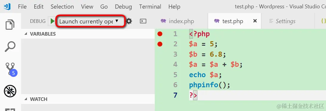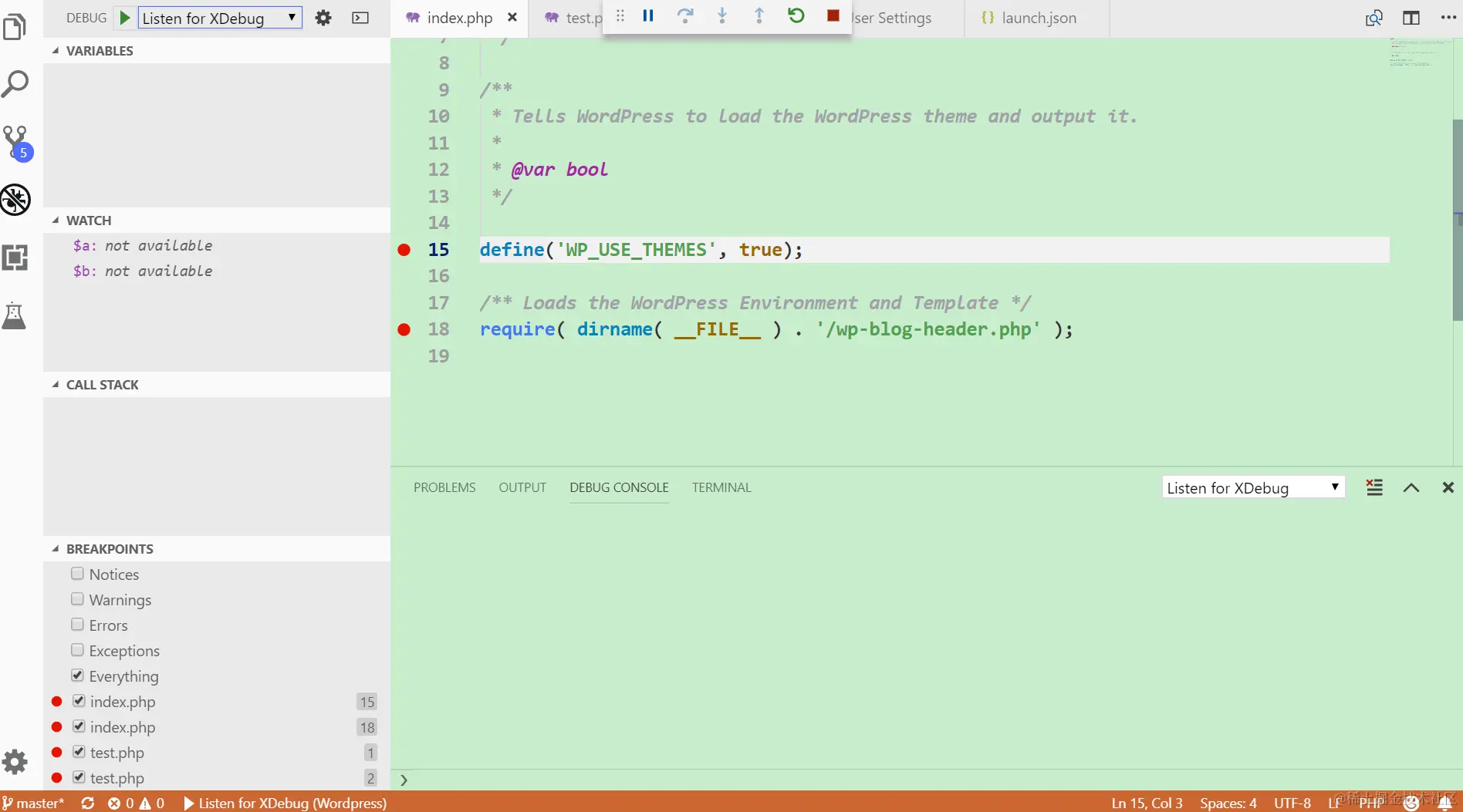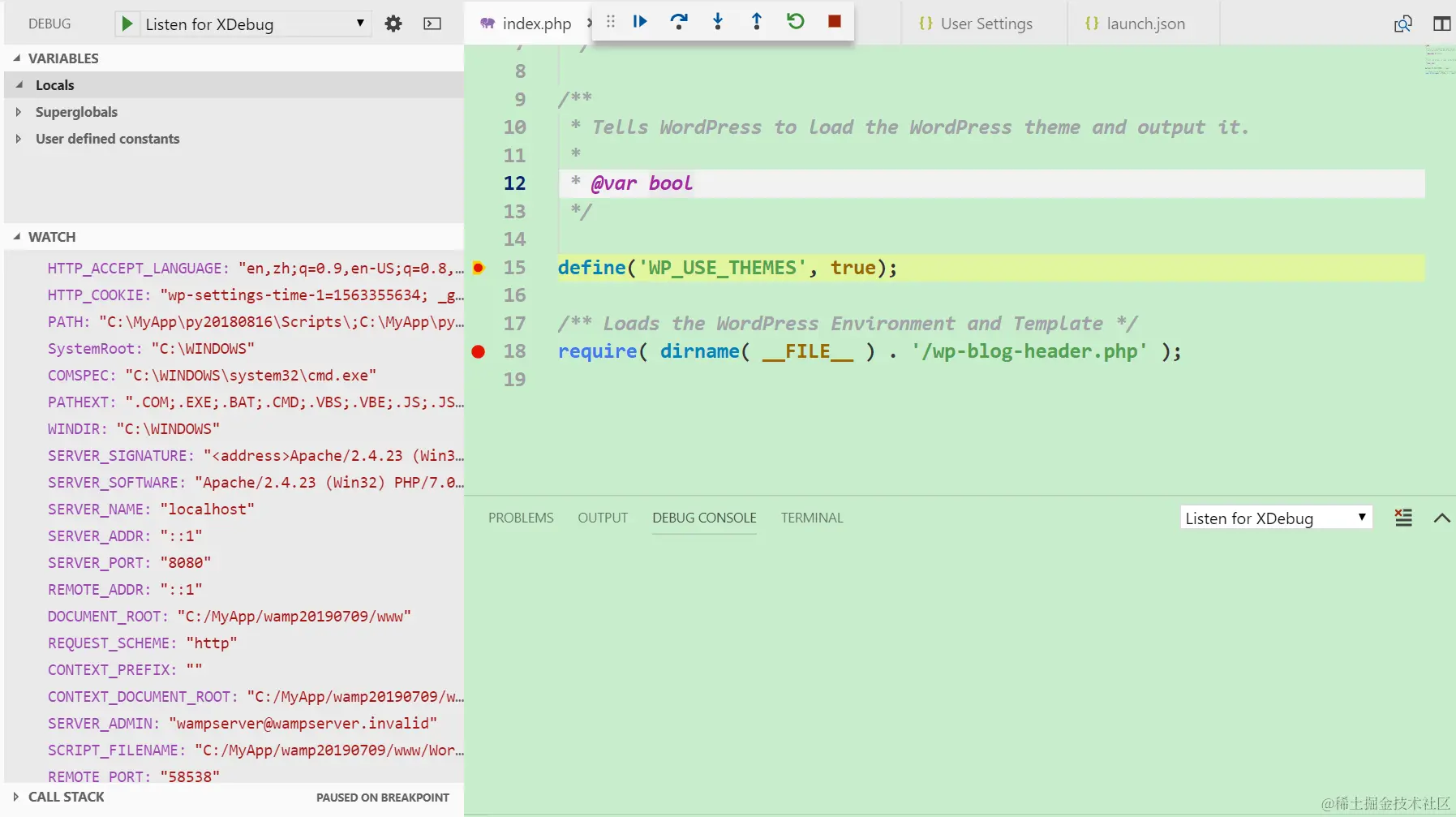 然后浏览器里访问待调试的PHP文件,Visual Studio Code的断点即触发,可以单步调试了: