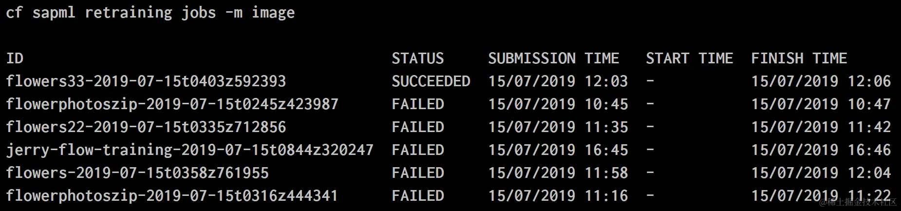 如何查看SAP Leonardo模型重新训练的日志 已注销 2021-04-25 91 阅读1分钟 使用命令行cf sapml retraining jobs -m image得到具体想查询的job id: 然后使用下列命令行把存储在AWS在线存储上的训练日志文件下载到本地: cf sapml fs get jerry-flow-training-2019-07-15t0858z810007/retraining.log ./retrain.log 要获取更多Jerry的原创文章,请关注公众号"汪子熙":