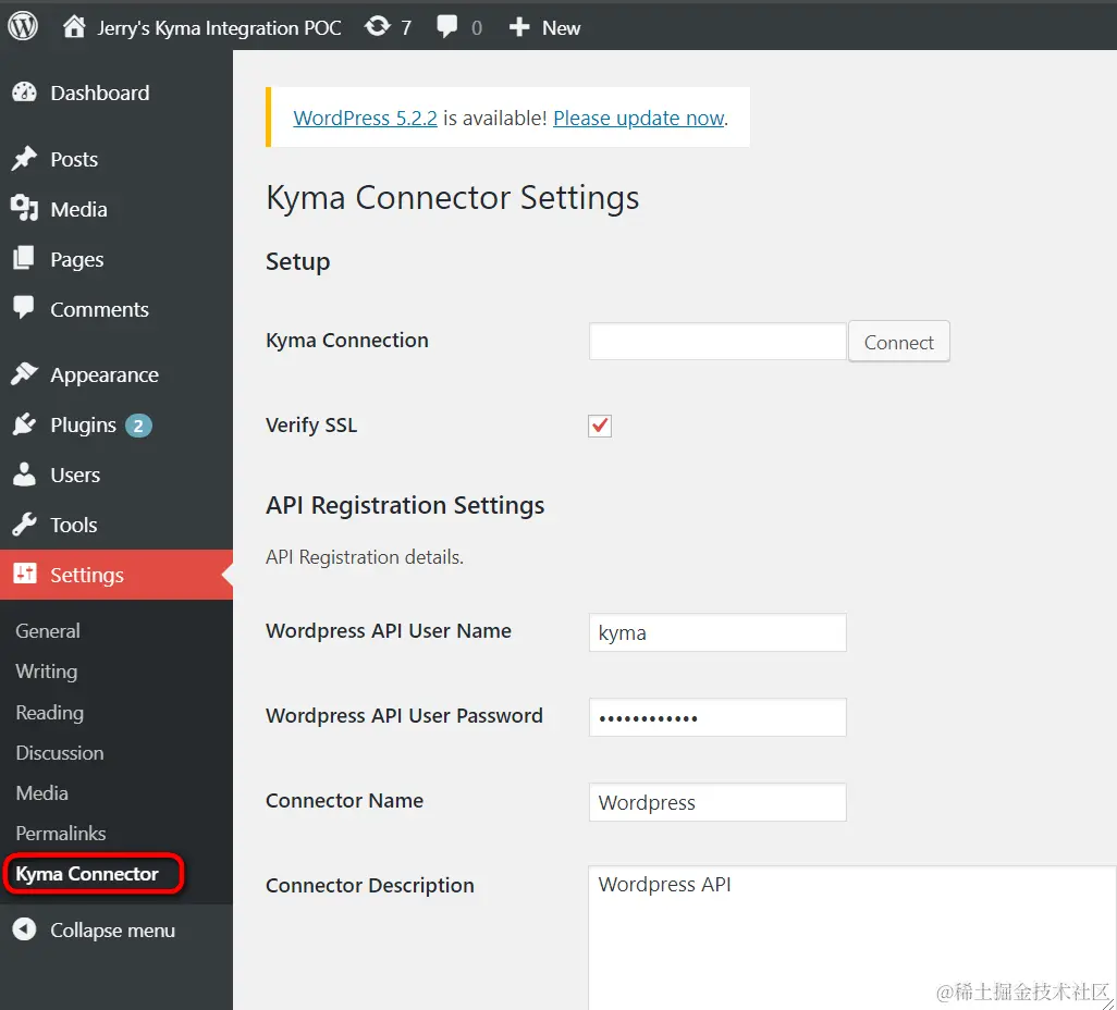 先看下WordPress增强之后的效果。在WordPress设置页面里,多出来一个叫做Kyma Connector的配置选项,里面可以定义同Kyma实例的连接细节。