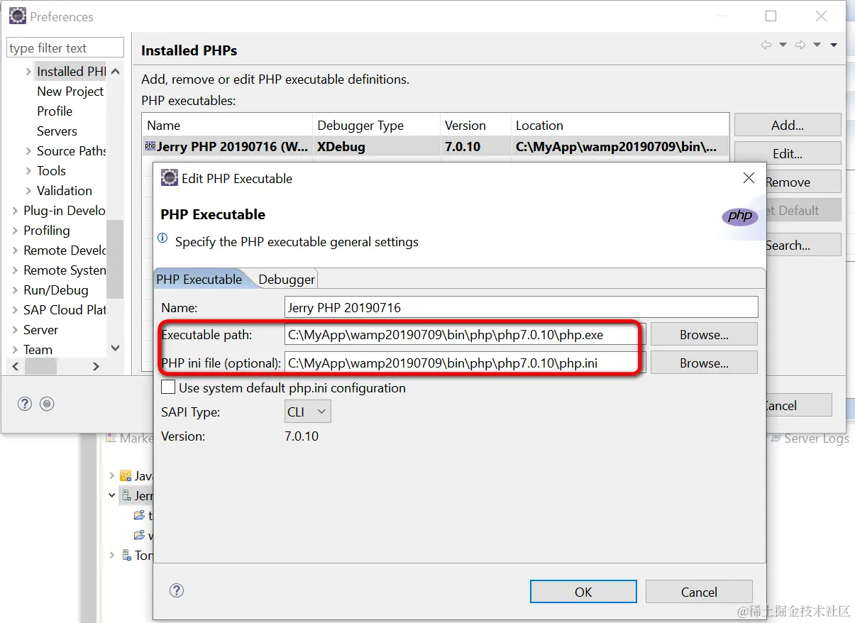 在Eclipse里新建一个PHP执行环境,Executable path和PHP ini指向WAMP里PHP文件夹里对应的文件: