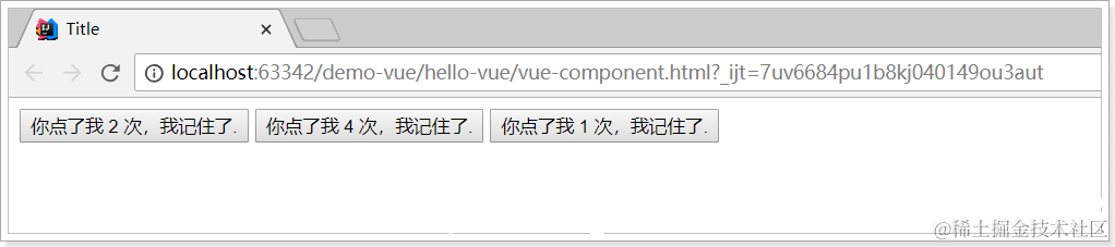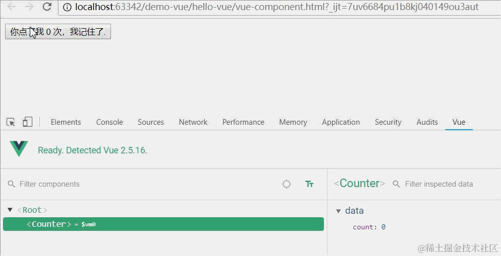 - 效果与刚才的全局注册是类似的,不同的是,这个counter组件只能在当前的Vue实例中使用