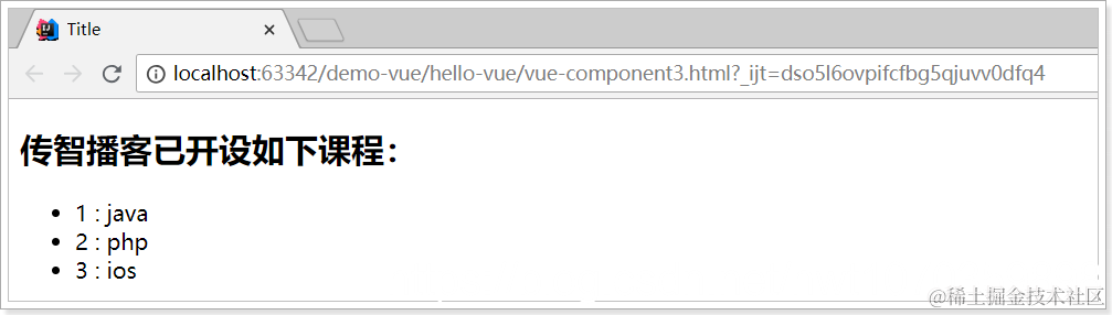 <li v-for="item in items" :key="item.id">{{item.id}} : {{item.name}}</li>\