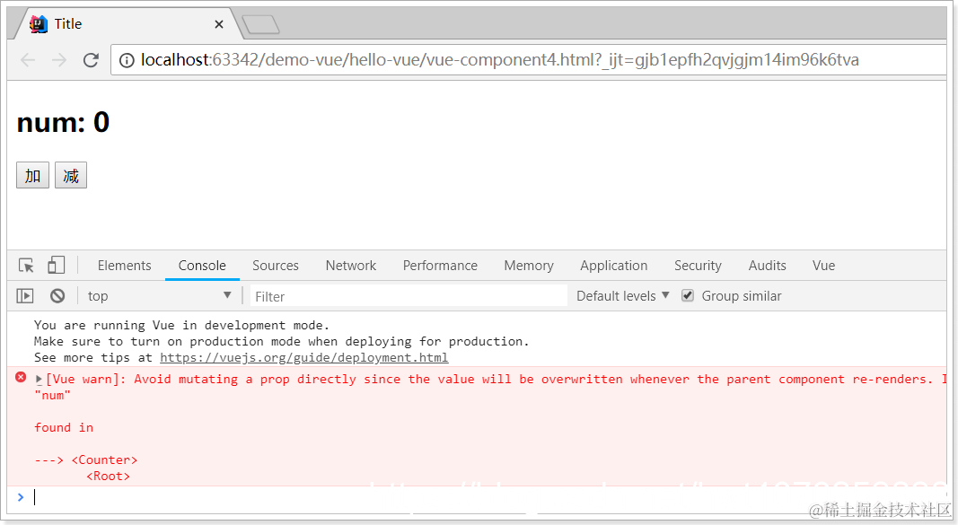Vue.component("counter", {// 子组件,定义了两个按钮,点击数字num会加或减