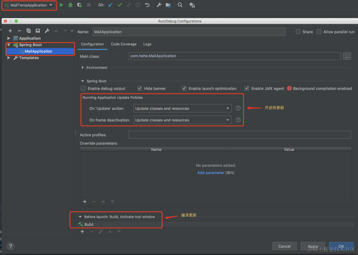 具体步骤:顶部菜单- >Edit Configurations->SpringBoot插件->目标项目->勾选热更新。