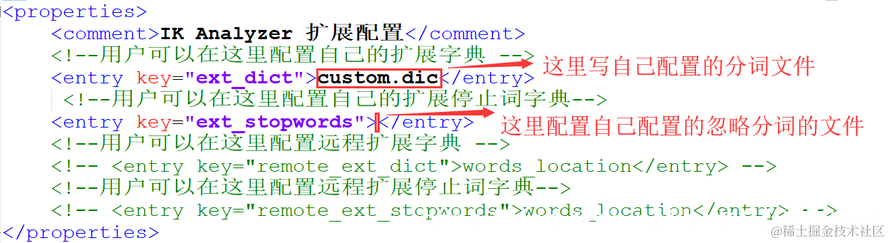 - 在ik的config文件下的IKAnalyzer.cfg.xml文件下,配置加载自己刚才创建的分词文件