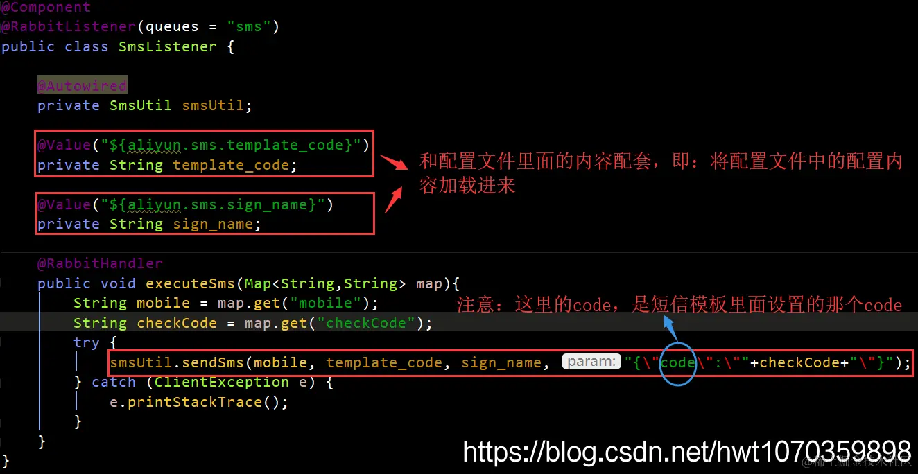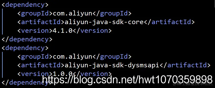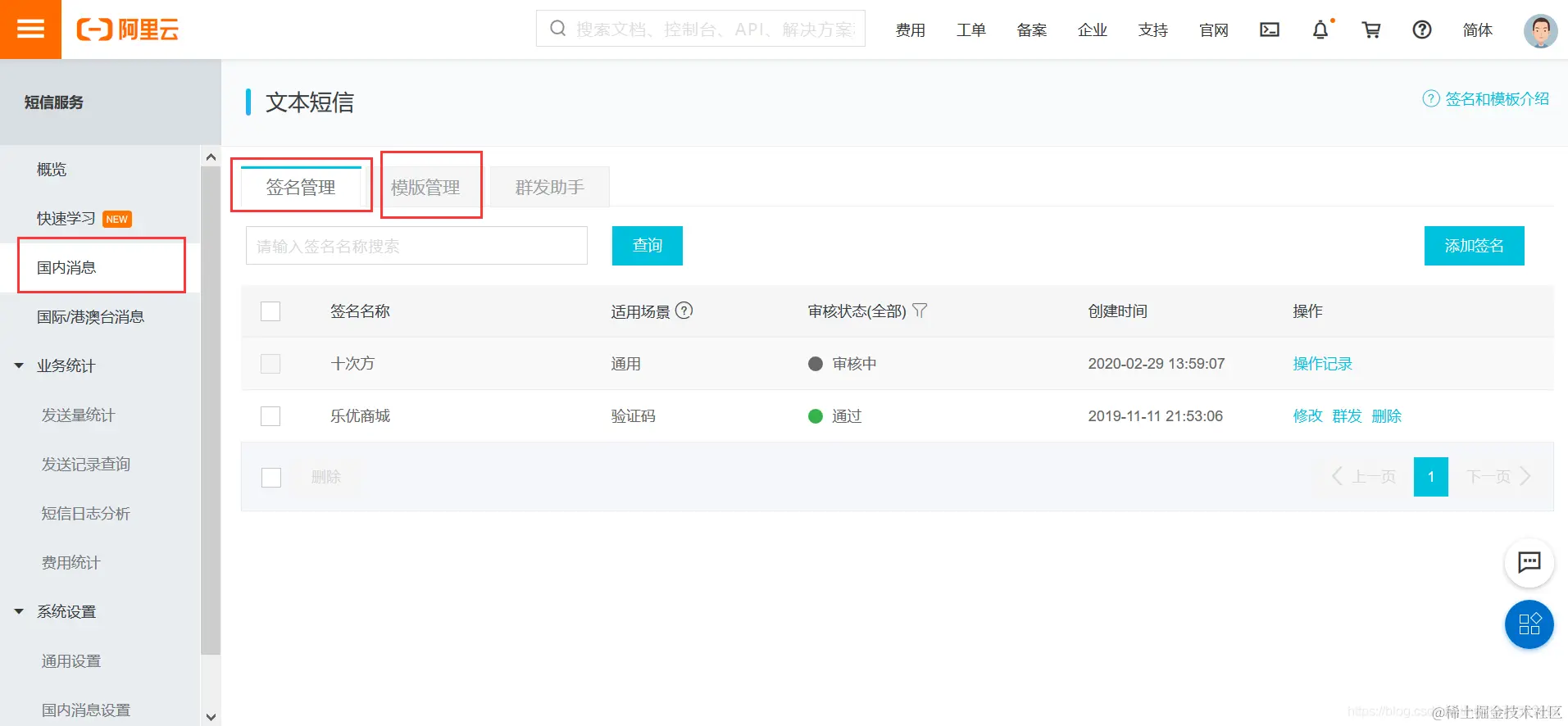 阿里云短信服务 用户5000949932284 2021-04-25 306 阅读1分钟 准备工作: 进入阿里云,登录自己的阿里云账号 控制台搜索“短信服务”,进入短信服务页面 确保自己的阿里云账户里面有费用,自己学习开发的话,不需要太多,几块钱就够 申请签名和模板,注:必须申请,否则不可用,审查时长一般2小时左右 通行证: 代码操作: 这个版本更新的,新版本的不会用,旧版本的代码难找,留个代码网址,以备后用:help.aliyun.com/document_de… 导包: 配置文件内配置这些内容: 发送消息处使用: