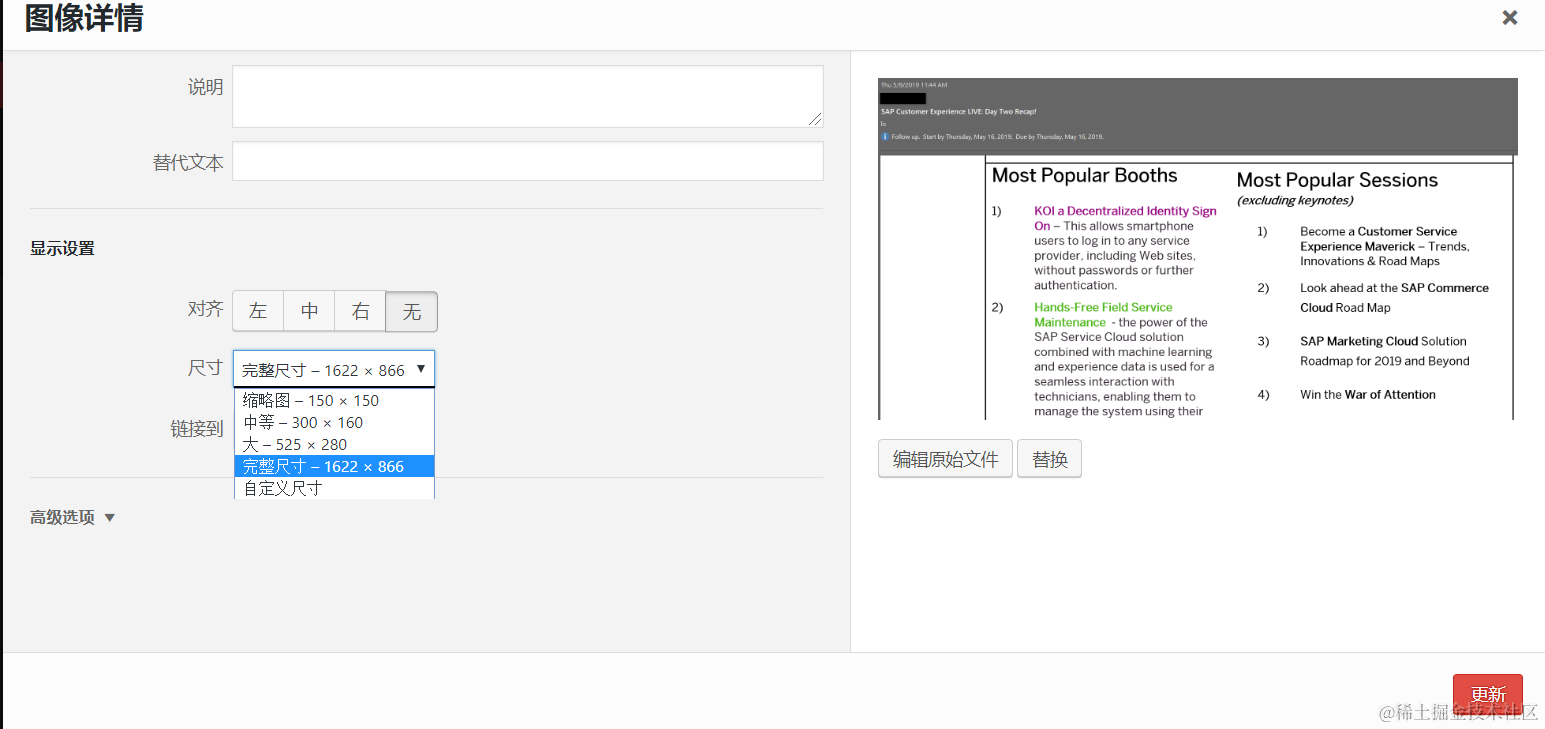 Wordpress上传图片的存储逻辑 已注销 2021-04-25 60 阅读1分钟 我编辑一篇文章,上传一张图片后, 有多个尺寸可供选择: 这些不同尺寸的图片文件,位于wp-content目录的uploads文件夹下,以年月作为下级目录来区分: 要获取更多Jerry的原创文章,请关注公众号"汪子熙":