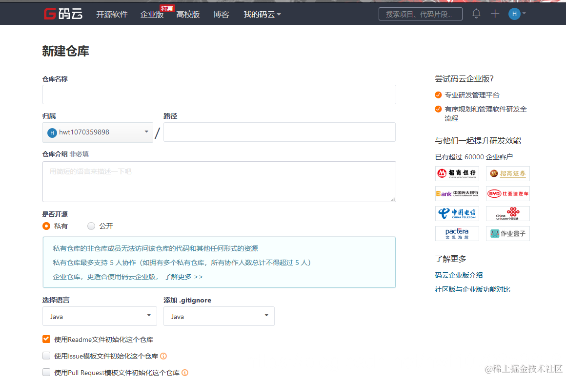 1、在码云新建仓库,命名与项目名一致