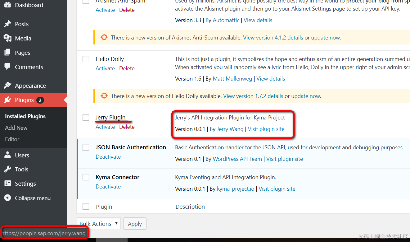回到Wordpress的PHP管理界面,刷新,即可看到这个空的plugin,其中jerry.php注释里维护的每一个字段都是有意义的,对应plugin界面如下内容: