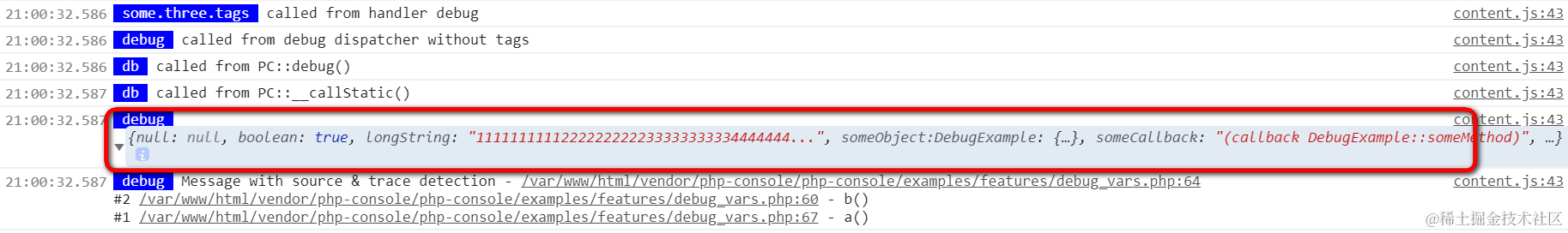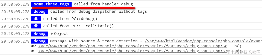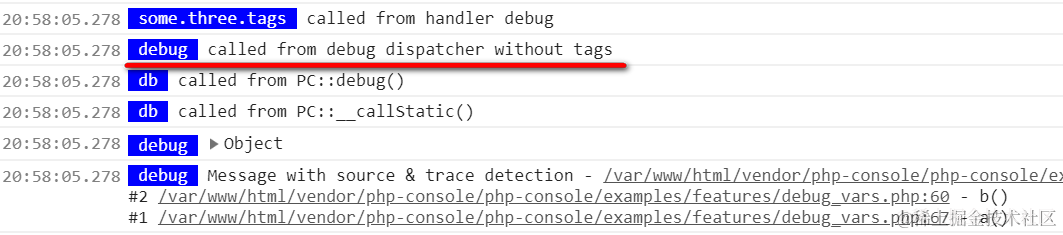 PhpConsole\Connector::getInstance()->getDebugDispatcher()->dispatchDebug(‘called from debug dispatcher without tag s’);