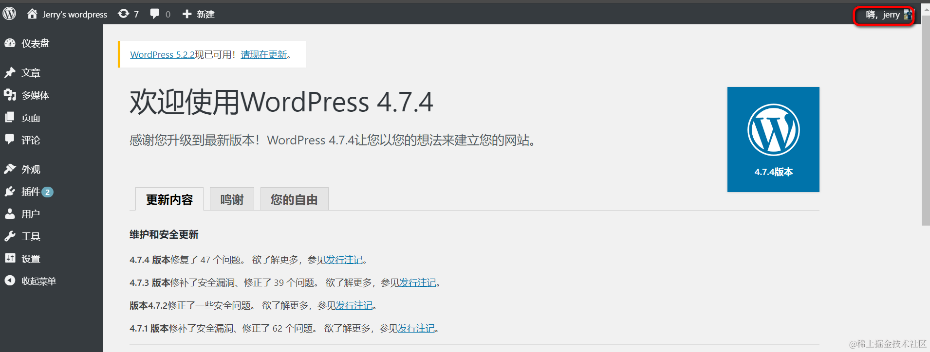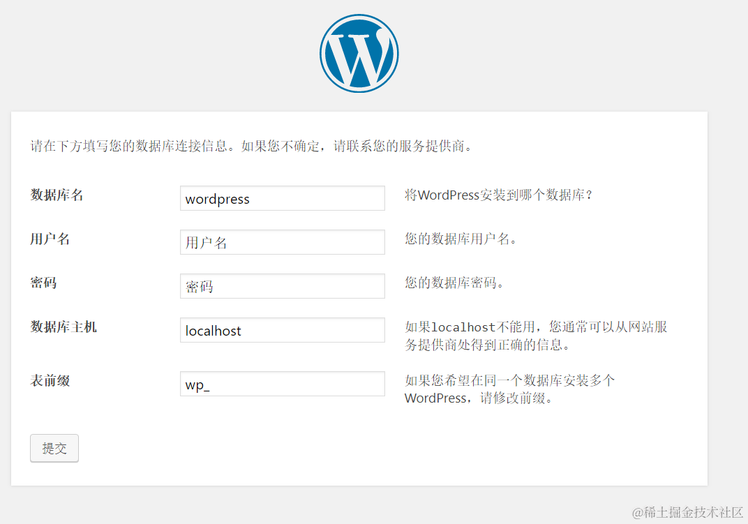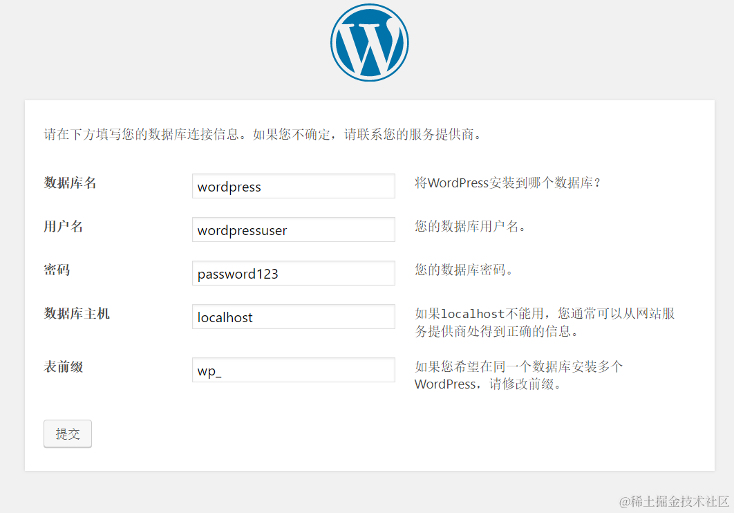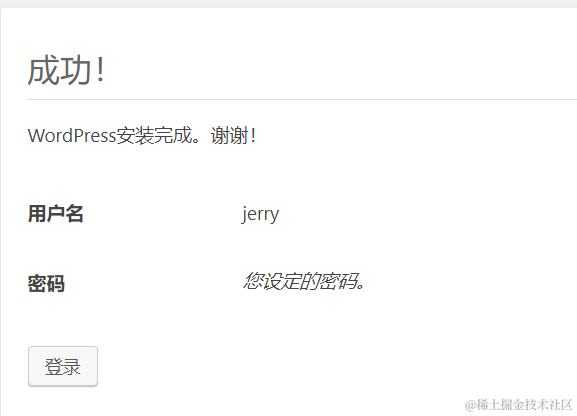 ubuntu上的wordpress安装 已注销 2021-04-25 119 阅读1分钟 sudo mv wordpress/* /var/www/html/ 然后访问如下的url,执行setup-config.php按照提示进行安装: http://:9015/wp-admin/setup-config.php 填入如下信息: 点击提交按钮后,看到下面的信息维护界面: 点击登录按钮,即可看到wordpress的管理页面了: 要获取更多Jerry的原创文章,请关注公众号"汪子熙":
