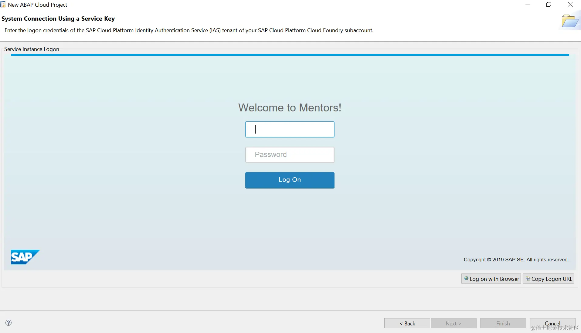 点Next,在ABAP Development Tools里会看到一个嵌入的登录窗口。因为Jerry使用的是SAP社区Mentor的账号,所以登录窗口显示的标题是:Welcome to Mentors!