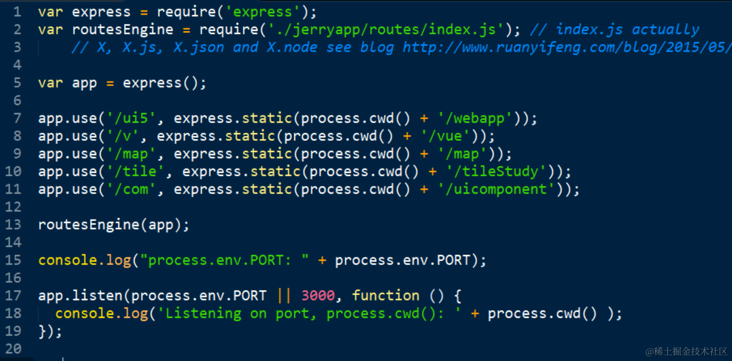 server.js的实现很简单,用nodejs的express module起一个server,把来自url "/ui5"的请求路由到文件夹webapp里,最后监听在环境变量PORT指定的端口号或者3000这个端口上。