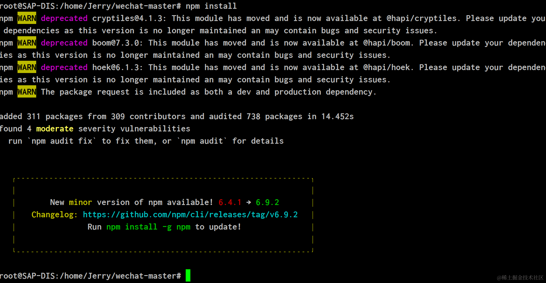 最后登录阿里云,git clone把这个仓库克隆到阿里云上,npm install安装package.json文件里描述的依赖: