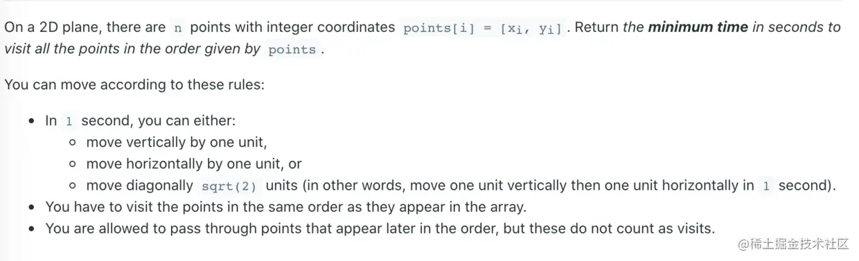 方法: 当前点到下一个点的最短时间就是y坐标差和x坐标差的最大值,较小值可以通过斜着走覆盖。