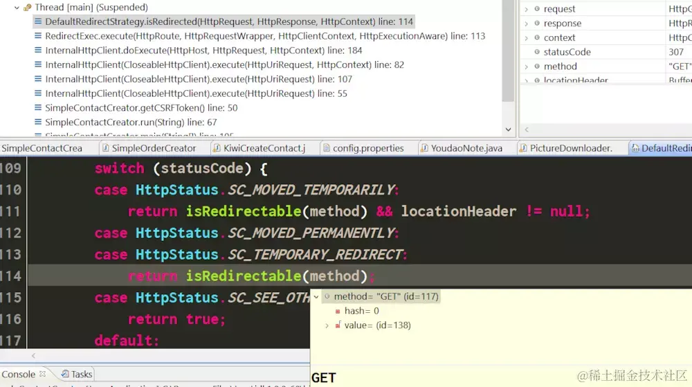 我的后台服务器返回的307,落到了分支HttpStatus.SC_TEMPORARY_REDIRECT处: