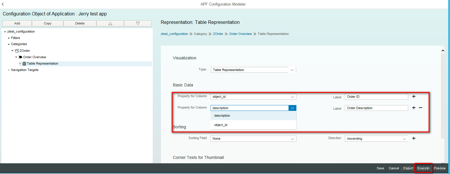 Here for representation type, I just choose the most simple one: Table. Choose property from drop down list for table display.