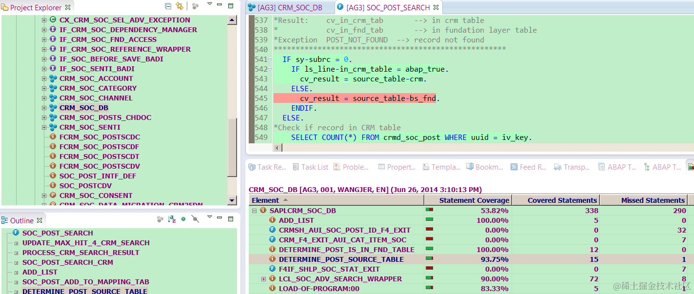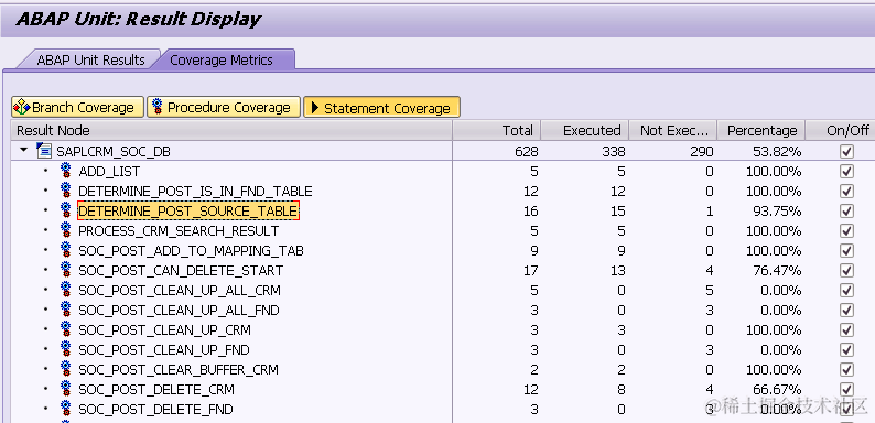 How to get ABAP code coverage result 已注销 2021-04-25 84 阅读1分钟 ABAP in Eclipse 执行完毕后会显示出测试覆盖率和未被覆盖到的代码: ABAP GUI 等价于下面在SE80里的操作: 要获取更多Jerry的原创文章,请关注公众号"汪子熙":